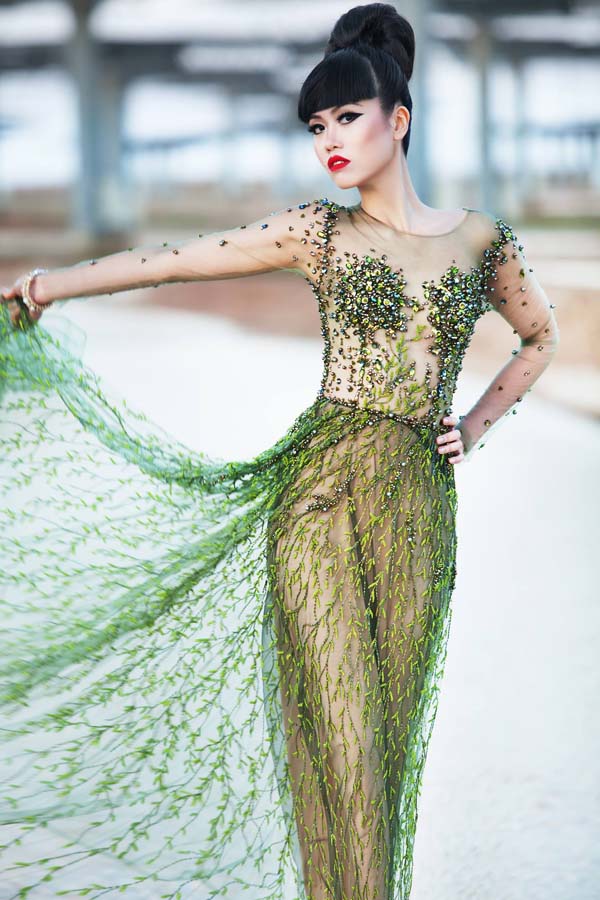 Trong suốt 12 giờ của buổi chụp hình, Jessica Minh Anh mặc trang phục dạ hội lộng lẫy của nhà thiết kế Việt Nam Hoàng Hải và thiết kế phong cách flamenco.
