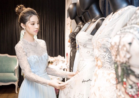 Ở sự kiện khai trương lần này, NTK Tùng Vũ cũng giới thiệu những trang phục ready to wear đầy tinh tế. Vốn là người đam mê thời trang, Jolie Nguyễn hào hứng lựa chọn những trang phục phù hợp cho bản thân ở các sự kiện sắp tối. Hoa hậu Thế giới người Việt chịu khó thay một chiếc váy khác để cân chỉnh phù hợp.