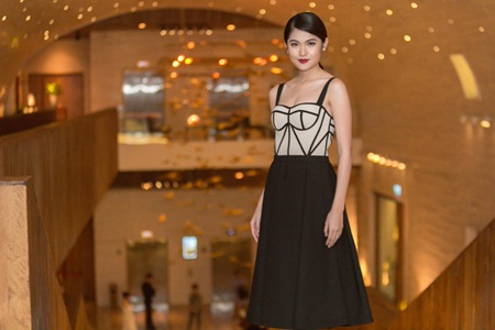 Trong khi đó, Á hậu Thuỳ Dung chọn phong cách cổ điển để xuất hiện trên thảm đỏ. Chiếc đầm tông màu trắng đen của nhà thiết kế Công Trí khoe khéo vóc dáng mảnh mai và bờ vai gợi cảm cho người đẹp.