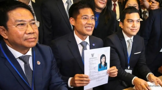 Chủ tịch đảng Thai Raksa Chart (giữa) cầm trên tay tờ đăng ký ứng cử Thủ tướng của công chúa Ubolratana hôm 8.2 - Ảnh: Reuters. |
