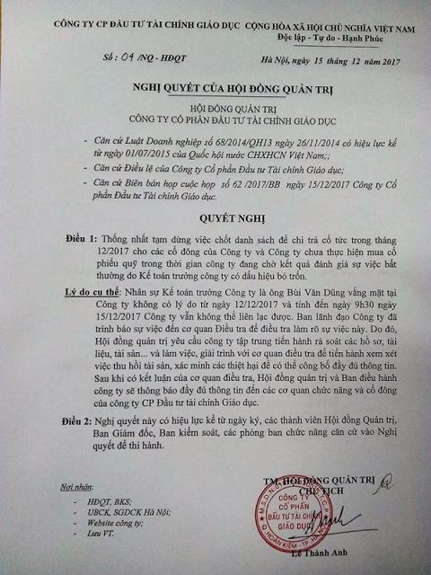 Ngày 15/12, Hội đồng quản trị công ty đã thống nhất tạm dừng việc chốt danh sách cổ đông để trả cổ tức trong tháng 12/2017 và chưa thực hiện mua cổ phiếu quỹ trong thời gian công ty đang chờ kết quả đánh giá sự việc bất thường do Kế toán trưởng có dấu hiệu bỏ trốn.