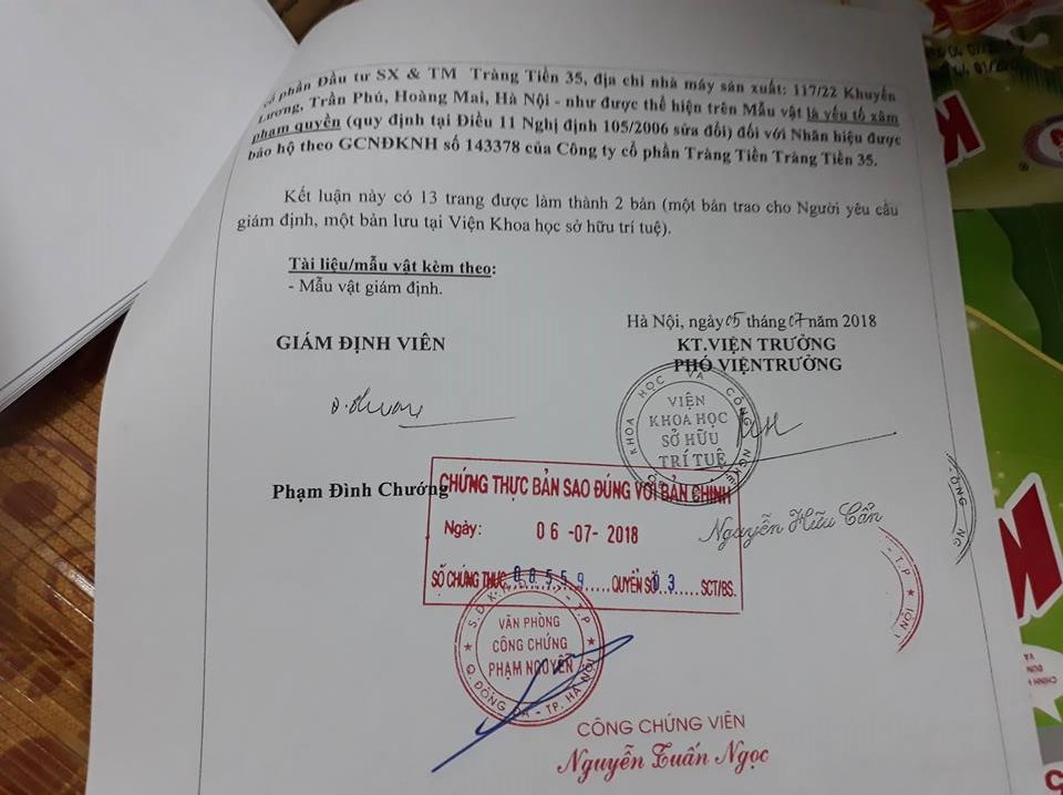 Liên quan đến vấn đề này, ông Hoàng Văn Cơ, Giám đốc Công ty cổ phần Đầu tư SX & TM Tràng Tiền 35 cũng thừa nhận về việc nhãn mác, nhãn hiệu sản phẩm của công ty có phần giống với Công ty cổ phần Tràng Tiền Tràng Tiền 35. Do đó, để không gây hiểu nhầm, ông Cơ cam kết sẽ thay đổi nhãn mác nhãn hiệu sản phẩm trong thời gian tới để không làm ảnh hưởng đến doanhg nghiệp bạn.