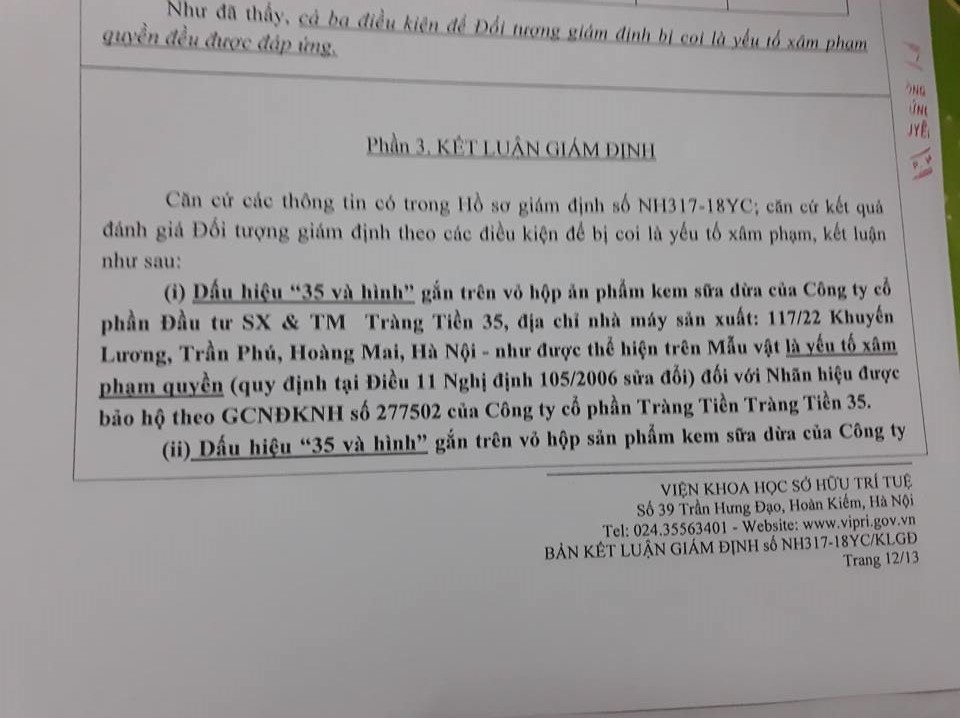 “Dấu hiệu “35 và hình” gắn trên vỏ hộp sản phẩm kem sữa dừa của Công ty cổ phần Đầu tư SX & TM Tràng Tiền 35, địa chỉ nhà máy sản xuất: 117/22 Khuyến Lương, Trần phú, Hoàng Mai, Hà Nội – như được thể hiện trên Mẫu vật là yếu tố xâm phạm quyền (quy định tại Điều 11 Nghị Định 105/2006 sửa đổi) đối với Nhãn hiệu được bảo hộ theo GCNĐKNH số 277502 của Công ty cổ phần Tràng Tiền 35.