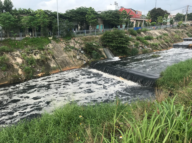 Nước đen đặc, sủi bọt trắng xóa dưới kênh Ba Bò - Ảnh: Thu Dung |