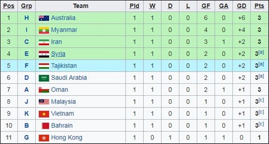 5 đội nhì bảng đang có thành tích tốt nhất đều đã giành được một chiến thắng với hiệu số bàn thắng bại rất cao, đó là U23 Australia (hiệu số +6), Myanmar (+4), Iran (+2), Syria (+2) và Tajikistan (+2).