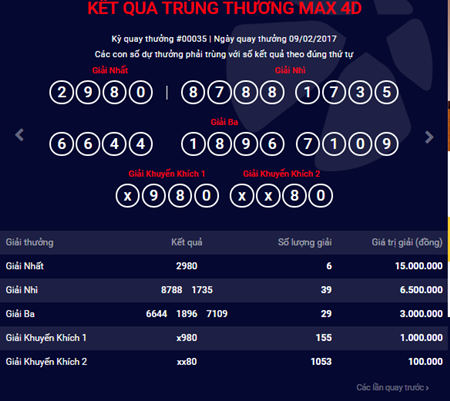 Kết quả xổ số điện toán Vietlott ngày 9/2. Đây là kỳ quay thứ 35 của loại hình xổ số MAX 4D.