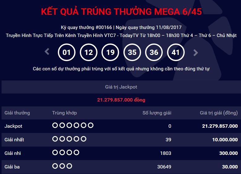 Theo thông tin từ Công ty xổ số điện toán Việt Nam (Vietlott), kỳ quay thưởng thứ 166 của xổ số Mega 6/45 đã kết thúc mà không thể tìm ra chủ nhân của giải Jackpot trị giá 21.279.857.000 đồng.
