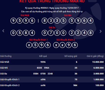 Bộ số may mắn trong kỳ quay thưởngthứ 63 là: 9596. Theo quy định Vietlott, mỗi người chơi may mắn trúng giải nhất xổ số MAX 4D sẽ nhận được số tiền lên đến 15 triệu đồng.
