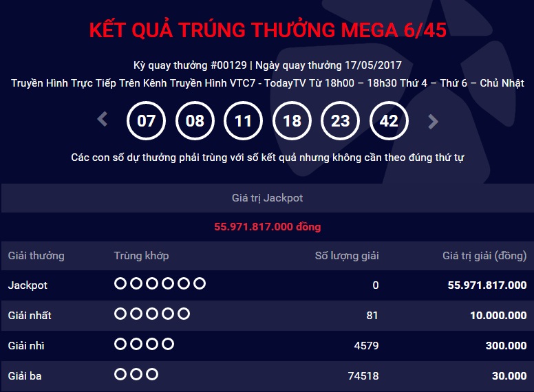 Theo thông tin mới nhất từ Công ty xổ số điện toán Việt Nam (Vietlott), tại kỳ quay thưởng thứ 129 của xổ số Mega 6/45 đã kết thúc mà không thể tìm ra chủ nhân của giải Jackpot trị giá 55.971.817.000 đồng.