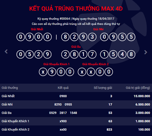 Bộ số may mắn trong kỳ quay thưởngthứ 63 là:0900.. Theo quy định Vietlott, mỗi người chơi may mắn trúng giải nhất xổ số MAX 4D sẽ nhận được số tiền lên đến 15 triệu đồng.
