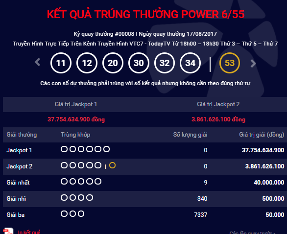 Trước đó, tại kỳ quay thưởng thứ 8 của xổ số Power 6/55 mở thưởng ngày 17/8 đã kết thúc mà không thể tìm ra chủ nhân của giải Jackpot 1 trị giá 37.754.634.900 đồng.