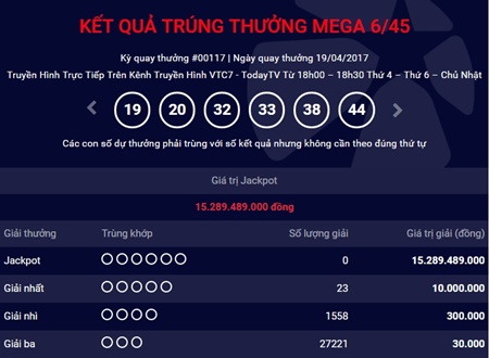 Trước đó, tại kỳ quay thứ 117, xổ số Vietlott đã không thể tìm ra chủ nhân của giải Jackpot trị giá 15.289.489.000 đồng. Dãy số may mắn trong kỳ quay thưởng lần này là: 19 - 20 - 32 - 33 - 38 - 44.