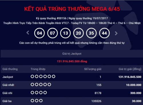 Trước đó, tại kỳ quay thưởng thứ 156 của xổ số Mega 6/45 mở thưởng ngày 19/7 đã kết thúc với tìm ra chủ nhân của giải Jackpot trị giá 131.916.845.500 đồng. Đây là giải Jackpot thứ 30 sau 1 năm hoạt động.