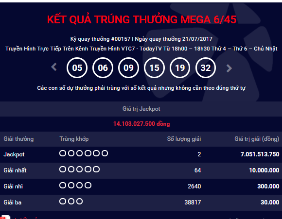 Trước đó, tại kỳ quay thưởng thứ 156 của xổ số Mega 6/45 mở thưởng ngày 19/7 đã kết thúc bằng việc tìm ra chủ nhân của giải Jackpot trị giá 131.916.845.500 đồng. Đây là giải Jackpot thứ 30 sau 1 năm hoạt động.
