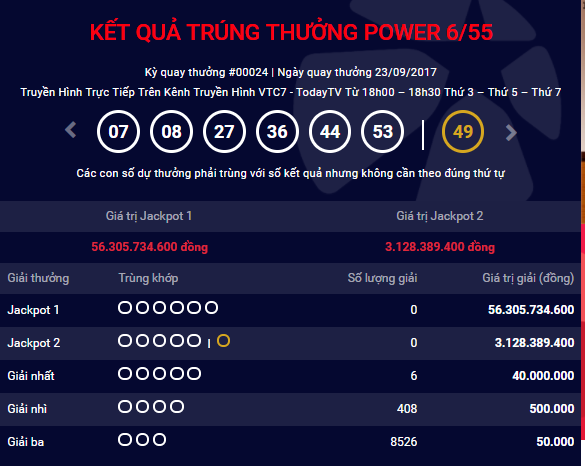 Bộ số may mắn trong kỳ quay thưởng lần này là: 07– 08 - 27 – 36 – 44 – 53. Đặc biệt, trong kỳ quay thưởng thứ 24 của loại hình xổ số Power 6/55, Vietlott đã tìm ra khách hàng trúng thưởng giải Jackpot 2 trị giá 3.128.389.400 đồng. Con số may mắn để trúng giải jackpot 2 của xổ số Vietlott là số 49.