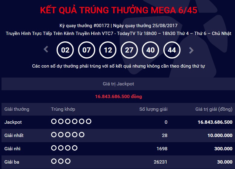 Theo quy định của xổ số Vietlott, do kỳ quay thưởng thứ 172 không thể tìm ra chủ nhân của giải Jackpot, số tiền 16.843.686.500 đồng sẽ được cộng dồn vào kỳ quay thưởng thứ 173 diễn ra vào ngày 27/8 tới. Nếu cộng thêm doanh thu bán vé, chủ nhân giải Jackpot có thể nhận được số tiền 20 tỷ đồng.