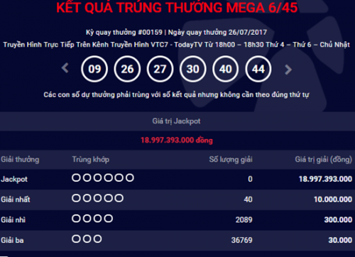 Trước đó, tại kỳ quay thưởng thứ 159 của xổ số Mega 6/45 mở thưởng ngày 26/7 đã kết thúc mà không thể tìm ra chủ nhân của giải Jackpot trị giá 18.997.393.000 đồng.