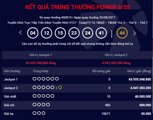 Bộ số may mắn trong kỳ quay thưởng lần này là: 04 – 12 - 15 - 23 - 24 – 41. Trong kỳ quay thưởng thứ 13của loại hình xổ số Power 6/55, Vietlott cũng không tìm ra khách hàng trúng thưởng giải Jackpot 2 trị giá 4.547.283.200 đồng. Con số may mắn để trúng giải jackpot 2 của xổ số Vietlott là số 44.