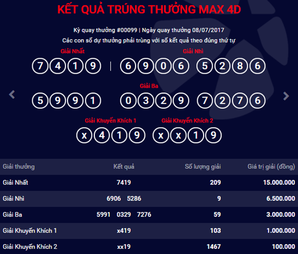Bộ số may mắn trong kỳ quay thưởng thứ 99 là: 7419. Theo quy định của xổ số Vietlott, mỗi người chơi may mắn trúng giải nhất xổ số MAX 4D sẽ nhận được số tiền trị giá 15 triệu đồng.