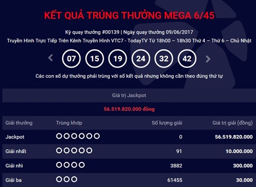 Theo thông tin mới nhất từ Công ty xổ số điện toán Việt Nam (Vietlott), kỳ quay thưởng thứ 139 của xổ số Mega 6/45 đã kết thúc mà không thể tìm ra chủ nhân của giải Jackpot trị giá 56.519.820.000 đồng.