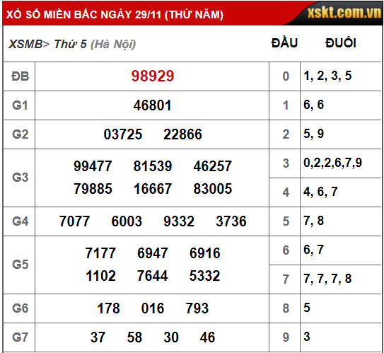 Kết quả xổ số miền Bắc hôm qua 29/11/2018. |