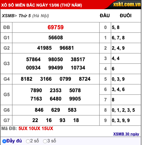 Kết quả xổ số miền Bắc ngày 13/6/2019: