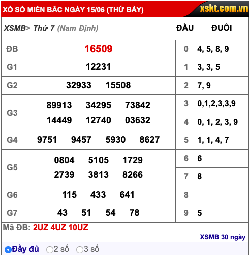 Kết quả xổ số miền Bắc hôm nay 15/6/2019: