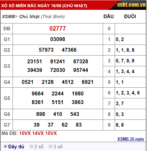 Kết quả xổ số miền Bắc hôm qua 16/6/2019: