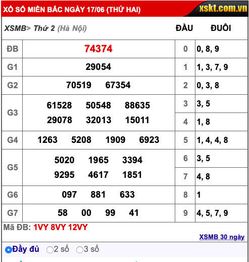Kết quả xổ số miền Bắc hôm nay 17/6/2019: