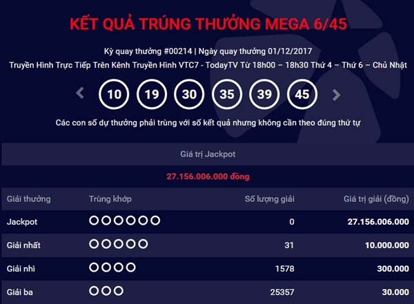 Dãy số may mắn trong kỳ quay thưởng thứ 214 của xổ số Mega 6/45 là 10 - 19 - 30 - 35 - 39 - 45. Cũng trong kỳ quay số mở thưởng thứ 214, Vietlott cũng đã xác định 31 người trúng giải nhất mỗi giải trị giá 10.000.000 đồng, 1.578 người trúng giải nhì mỗi giải trị giá 300.000 đồng, 25.357 người trúng giải ba mỗi giải trị giá 30.000 đồng.