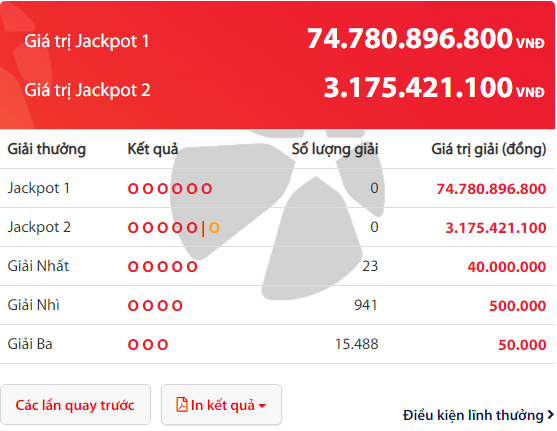 Theo thể lệ Vietlott, do kỳ quay thưởng 227 đã không tìm ra chủ nhân của giải độc đắc nên số tiền 74.780.896.800 đồng sẽ được cộng dồn vào giải Jackpot trong kỳ quay thưởng tiếp theo. Nếu cộng thêm tiền bán vé số, chủ nhân giải Jackpot 1 trong kỳ quay thưởng tới đây có thể nhận được số tiền lên đến 77 tỷ đồng.