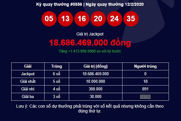 Theo quy định Vietlott, do kỳ quay 556 đã không tìm ra chủ nhân của giải độc đắc nên số tiền hơn 18 tỷ đồng sẽ được cộng dồn vào kì quay thưởng tiếp theo.