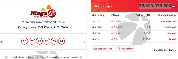 Trước đó, tại kỳ quay thưởng thứ 387 của xổ số Vietlott loại hình Mega 6/45 mở thưởng ngày 11/1 đã không tìm ra chủ nhân của giải Jackpot trị giá 35.699.076.500 đồng.