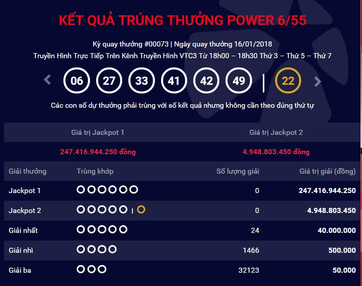 Bộ số may mắn trong kỳ quay thưởng lần này là: 06 – 27 – 38 – 41 – 42 – 49. Trong kỳ quay thưởng thứ 73 của loại hình xổ số Power 6/55, Vietlott cũng đã không tìm ra khách hàng trúng thưởng giải Jackpot 2 trị giá 4.948.803.450 đồng. Con số may mắn để trúng giải jackpot 2 của xổ số Vietlott là số 22.