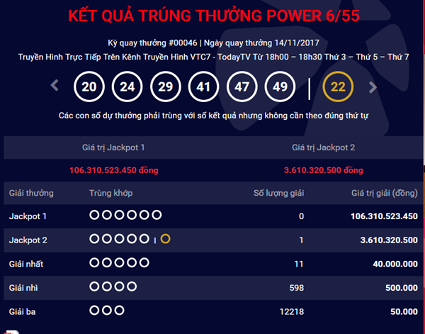 Trước đó, tại kỳ quay thưởng thứ 46 xổ số Power 6/55 mở thưởng ngày 14/11 đã kết thúc mà không thể tìm ra chủ nhân của giải Jackpot 1 trị giá 106.310.523.450 đồng.