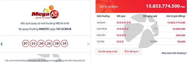 Trước đó, tại kỳ quay thưởng thứ 375 của xổ số Vietlott loại hình Mega 6/45 mở thưởng ngày 14/12 đã không tìm ra chủ nhân của giải Jackpot trị giá 15.853.774.500 đồng.