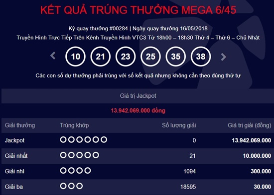 Dãy số may mắn trong kỳ quay thưởng thứ 284 của xổ số Mega 6/45 là: 10 – 21 23 – 25 – 35 – 38. Cũng trong kỳ quay số mở thưởng thứ 283, xổ xố Vietlott đã tìm ra 21 người trúng giải nhất mỗi giải trị giá 10.000.000 đồng, 1.094 người trúng giải nhì mỗi giải trị giá 300.000 đồng, 18.595 người trúng giải ba mỗi giải trị giá 30.000 đồng.