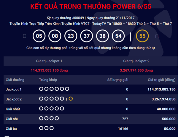 Bộ số may mắn trong kỳ quay thưởng lần này là: 05 - 08 – 23 – 37 – 38 – 54. Trong kỳ quay thưởng thứ 49 của loại hình xổ số Power 6/55, Vietlott đã không tìm ra tìm ra khách hàng trúng thưởng giải Jackpot 2 trị giá 3.267.974.850 đồng. Con số may mắn để trúng giải jackpot 2 của xổ số Vietlott là số 55.