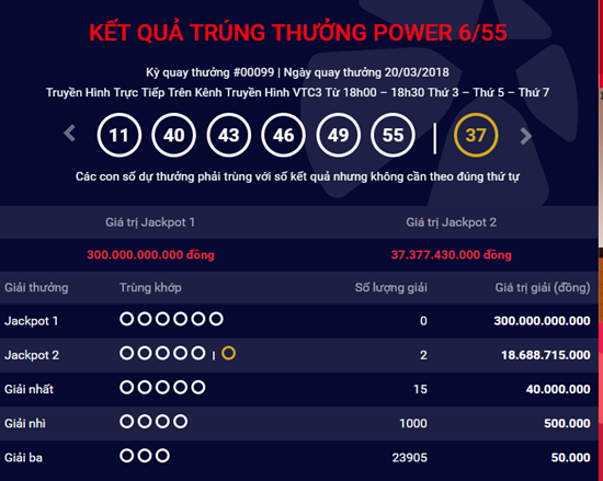 Bộ số may mắn trong kỳ quay thưởng lần này là: 11 – 40 – 43 – 46 – 49 – 55. Trong kỳ quay thưởng thứ 99 của loại hình xổ số Power 6/55, Vietlott cũng tìm ra 2 khách hàng trúng thưởng giải Jackpot 2 trị giá 37.377.430.000 đồng. Con số may mắn để trúng giải jackpot 2 của xổ số Vietlott là số 37.