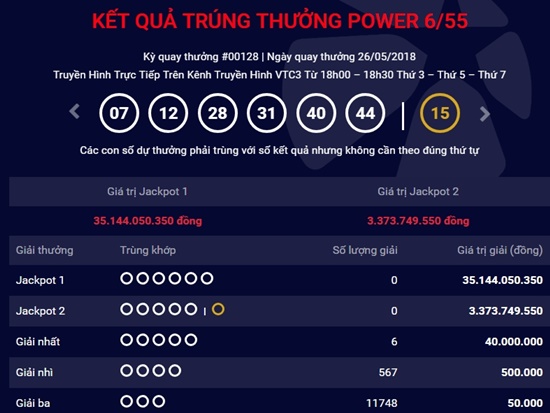 Bộ số may mắn trong kỳ quay thưởng lần này là: 07 – 12 – 28 – 31 – 40 – 44. Trong kỳ quay thưởng thứ 128 của loại hình xổ số Power 6/55, Vietlott cũng đã không tìm ra khách hàng trúng thưởng giải Jackpot 2 trị giá 3.373.749.550 đồng. Con số may mắn để trúng giải jackpot 2 của xổ số Vietlott là số 15.