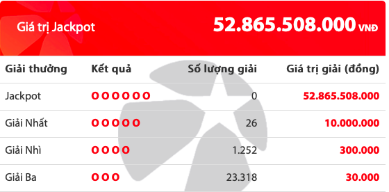 Theo quy định Vietlott, do kỳ quay 537 đã không tìm ra chủ nhân của giải độc đắc nên số tiền hơn 52 tỷ đồng sẽ được cộng dồn vào kì quay thưởng tiếp theo. Nếu cộng thêm doanh thu bán vé, chủ nhân giải Jackpot trong kỳ quay thưởng 538 có thể nhận được số tiền hơn 54 tỷ đồng.