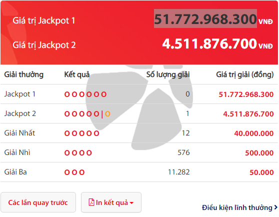 Trước đó, tại kỳ quay số mở thưởng thứ 283 xổ số Power 6/55 mở thưởng ngày 25/5 đã không tìm ra chủ nhân của giải Jackpot 1 trị giá 51.772.968.300 đồng.