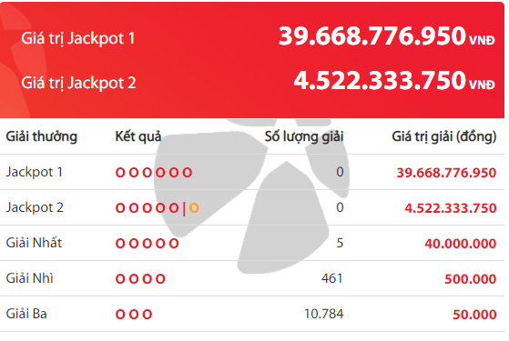 Theo thể lệ Vietlott, do kỳ quay thưởng 234 đã không tìm ra chủ nhân của giải độc đắc nên số tiền 39.668.776.950 đồng sẽ được cộng dồn vào giải Jackpot trong kỳ quay thưởng tiếp theo. Nếu cộng thêm tiền bán vé số, chủ nhân giải Jackpot 1 trong kỳ quay thưởng tới đây có thể nhận được số tiền lên đến 41 tỷ đồng.