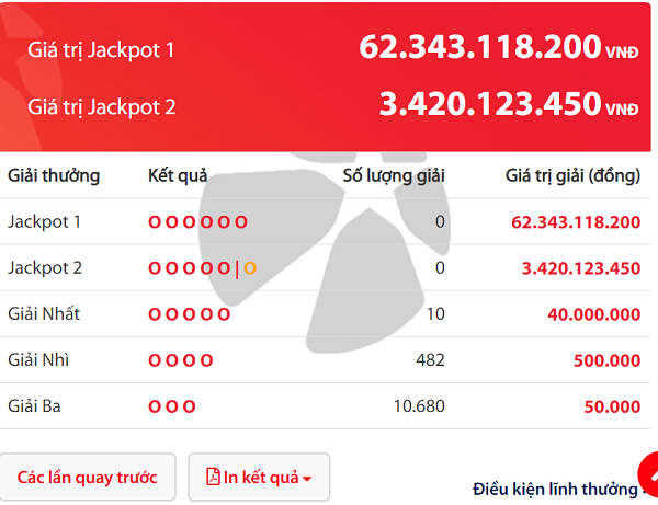 Theo thể lệ Vietlott, do kỳ quay thưởng 221 đã không tìm ra chủ nhân của giải độc đắc nên số tiền 62.343.118.200 đồng sẽ được cộng dồn vào giải Jackpot trong kỳ quay thưởng tiếp theo. Nếu cộng thêm tiền bán vé số, chủ nhân giải Jackpot 1 trong kỳ quay thưởng tới đây có thể nhận được số tiền lên đến 64 tỷ đồng. Chi tiết số người trúng xổ số Vietlott ngày 29/12.