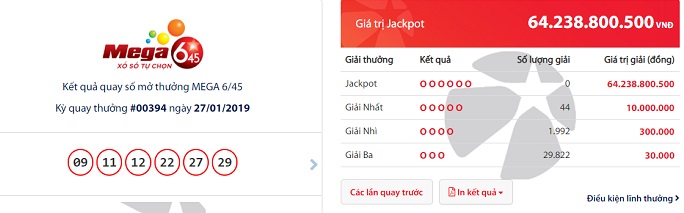 Theo thông tin mới nhất từ Công ty xổ số điện toán Việt Nam (Vietlott), tại kỳ quay thưởng thứ 394 của xổ số Vietlott loại hình Mega 6/45 mở thưởng ngày 30/1 đã không tìm ra chủ nhân của giải Jackpot trị giá 64.238.800.500 đồng.