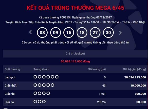 Dãy số may mắn trong kỳ quay thưởng thứ 215 của xổ số Mega 6/45 là 08 - 09 - 15 – 18 - 27 - 30. Cũng trong kỳ quay số mở thưởng thứ 215, Vietlott cũng đã xác định 43 người trúng giải nhất mỗi giải trị giá 10.000.000 đồng, 1.761 người trúng giải nhì mỗi giải trị giá 300.000 đồng, 29.024 người trúng giải ba mỗi giải trị giá 30.000 đồng.