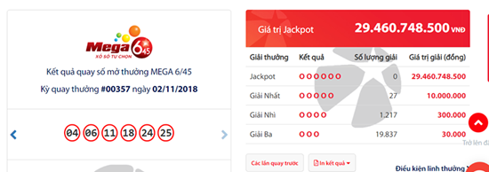 Trước đó, tại kỳ quay thưởng thứ 357của xổ số Vietlott loại hình Mega 6/45 mở thưởng ngày 2/11 đã không tìm ra chủ nhân của giải Jackpot trị giá 29.460.748.500 đồng.