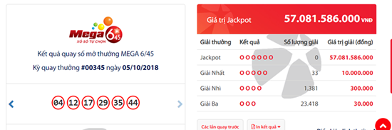 Trước đó, tại kỳ quay thưởng thứ 345 của xổ số Mega 6/45 mở thưởng ngày 5/10 đã không tìm ra chủ nhân của giải Jackpot trị giá 57.081.586.000 đồng.