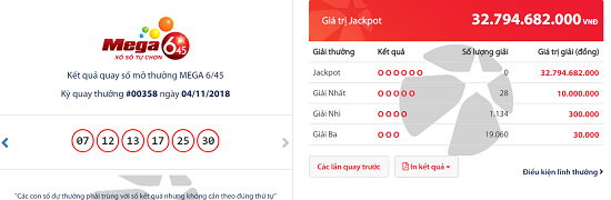 Trước đó, tại kỳ quay thưởng thứ 358 của xổ số Vietlott loại hình Mega 6/45 mở thưởng ngày 4/11 đã không tìm ra chủ nhân của giải Jackpot trị giá 32.794.682.000 đồng.