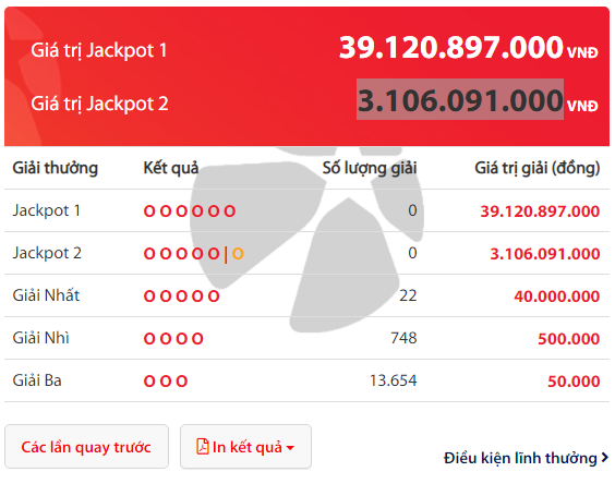 Trước đó, tại kỳ quay số mở thưởng thứ 275 xổ số Power 6/55 mở thưởng ngày 7/5 đã không tìm ra chủ nhân của giải Jackpot 1 trị giá 39.120.897.000 đồng.